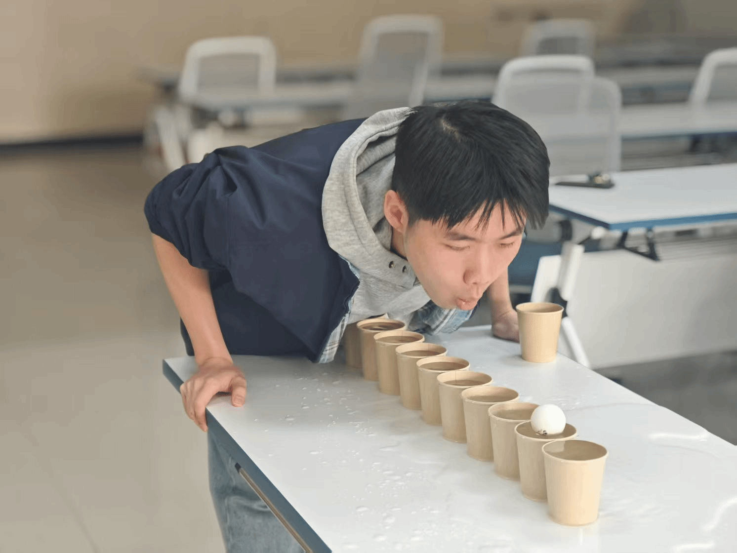 上午11时,本届院运会的乒乓球吹球接力赛在TapTap点点楼101举行。这项赛事中,运动员需要使用吹气方式使乒乓球依次通过5个盛水纸杯(间距50厘米),掉落需放回重试,计时最短者胜。运动员屏息俯首,用呼吸操控着乒乓球在湿滑杯沿间跃进,飞溅的水珠与倒计时器上的数字同步震颤。最终,徐瑞同学荣获冠军,黄远鑫同学荣获亚军,张恩玮同学荣获季军。