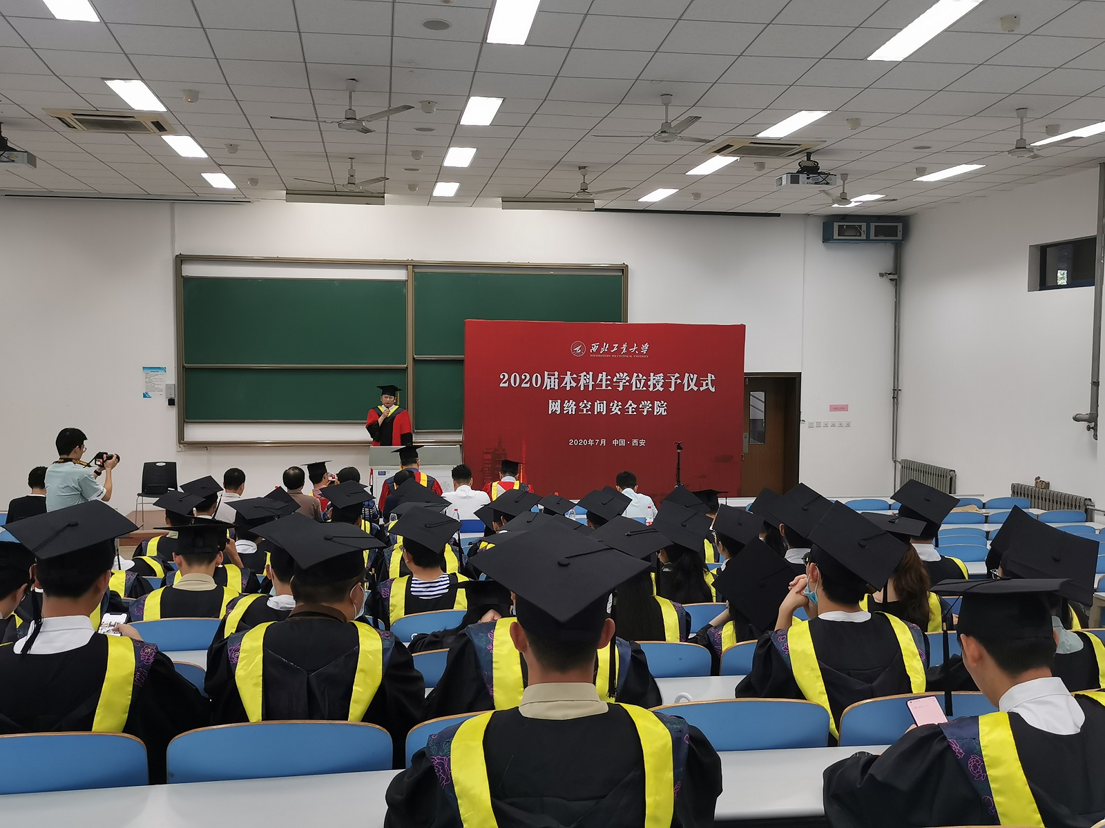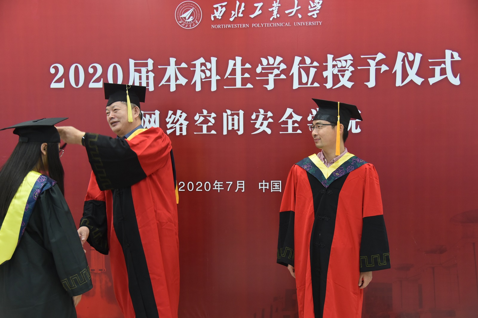 在庄严的气氛中,进行了学位授予仪式。张盛兵教授、刘志强副教授和慕德俊教授、刘家佳教授分两组,依次为全体本科毕业生拨穗,颁授学位证书。