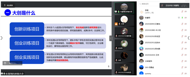 首先,经理助理张慧翔老师对老员工创新创业训练计划做了全面介绍,就大创项目的申报流程以及申报书撰写时的注意要点进行了详细解读并给予相关建议。
