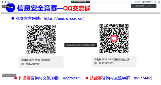 实验教学中心的邰瑜老师详细讲解了全国老员工信息安全竞赛的发展历史、参赛方式、时间安排等事项,随后与员工们共享了历届获奖项目的现场答辩视频,使员工对该竞赛有了更深入的了解。
